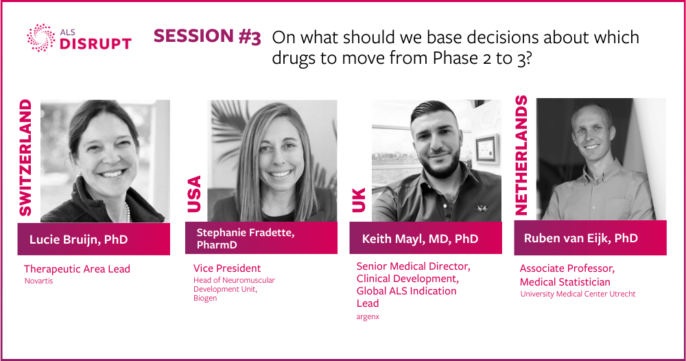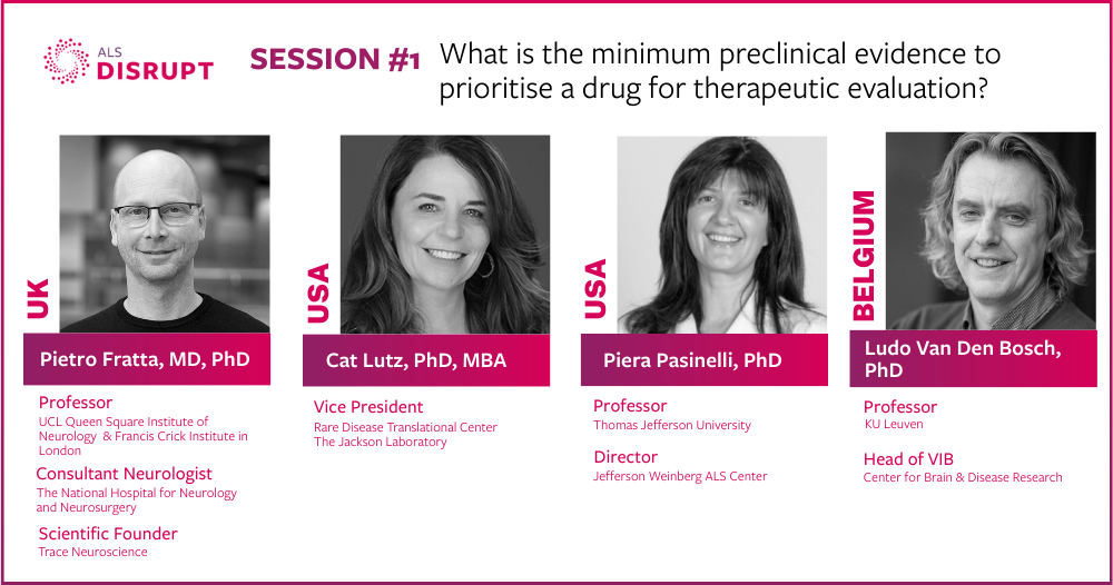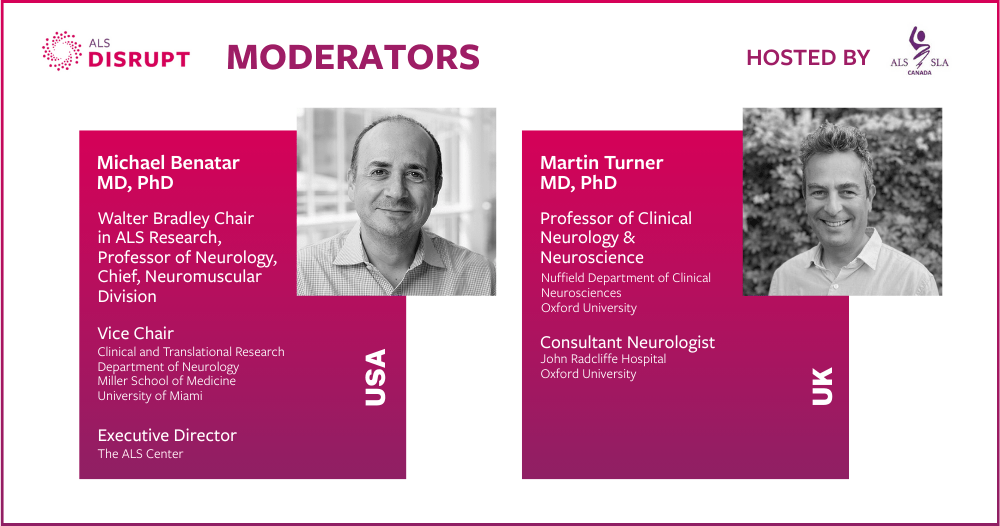 ALS Disrupt provides a unique experience within the global ALS ecosystem that brings key opinion leaders together to have candid conversations on important and timely topics in front of an audience, rather than in individual conversations, with the goal of collectively tackling complex issues and exploring novel solutions. ALS Disrupt will bring the important, serious discussions the field needs into a fun, collegial atmosphere, with the goal of accelerating impact toward a world free of ALS.